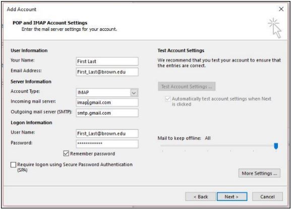 The steps below will display the process for adding the account. The screens will be displayed automatically if you are using Outlook for the first time. If you are adding your Brown Gmail account as an additional account, follow the steps below to start: