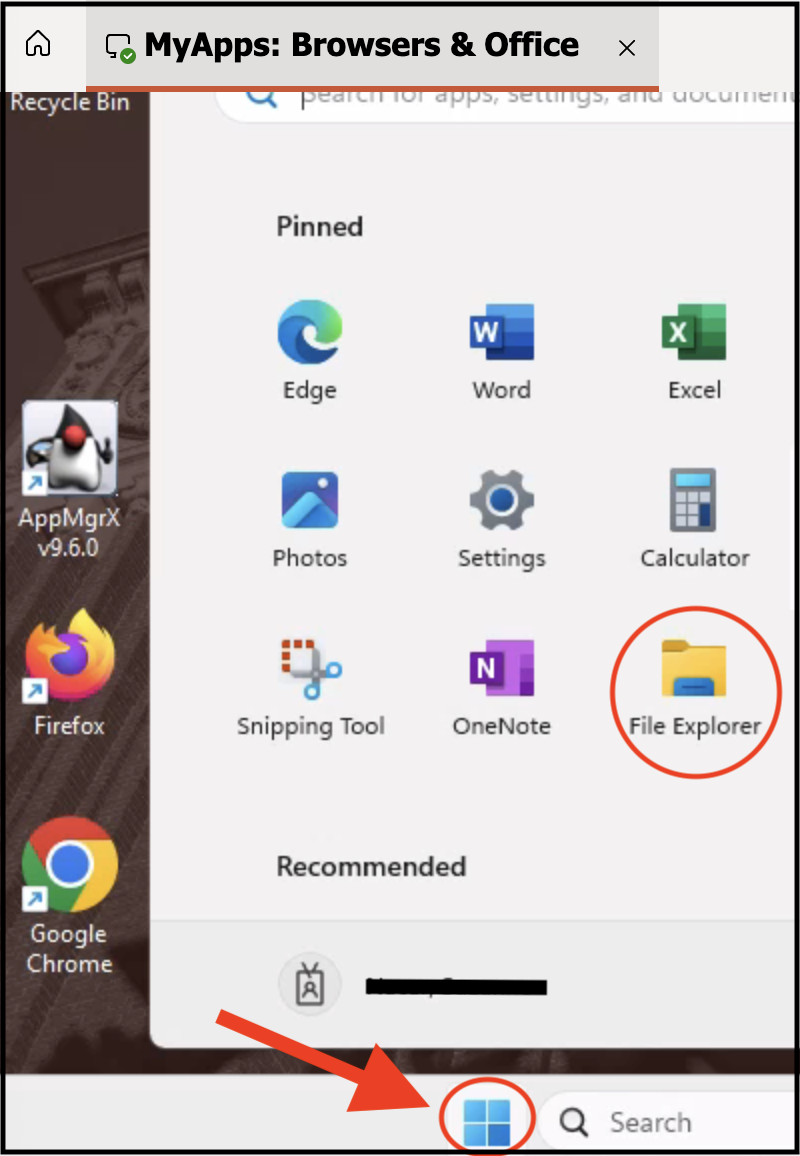 2. Once you have opened the MyApps Browsers & Office, click the start button at the bottom of the screen and select File Explorer. See image below:
