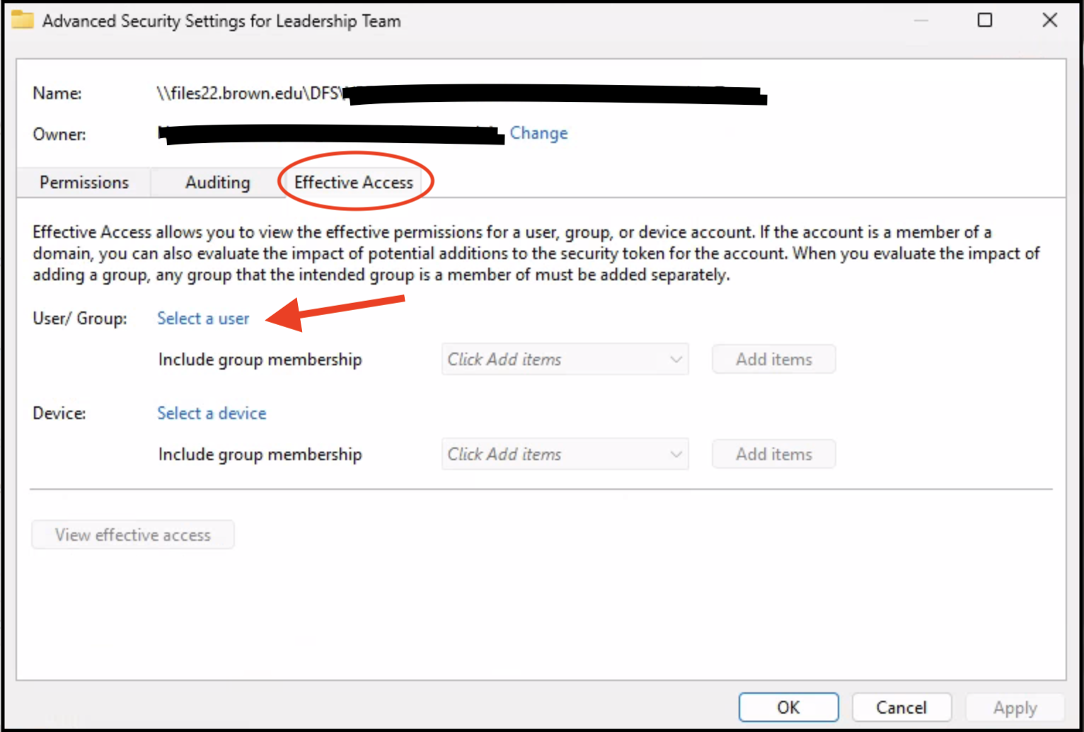 6. In the Advanced Security Settings window, select the Effective Access tab and click on "Select a user."
