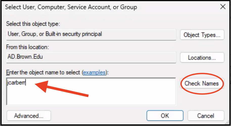Solution: If YOU have access to the folder, you can look up another individual by username (i.e. jcarberr rather than Josiah Carberry) to find out whether they have access. Follow the steps below: