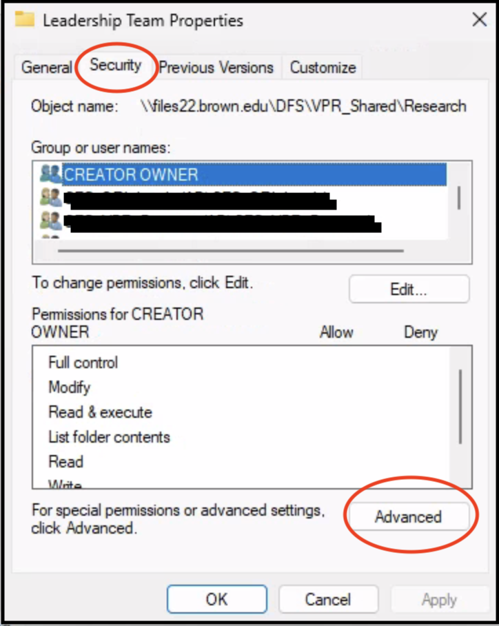 5. In the Properties window that comes up, select the Security tab and click on Advanced.