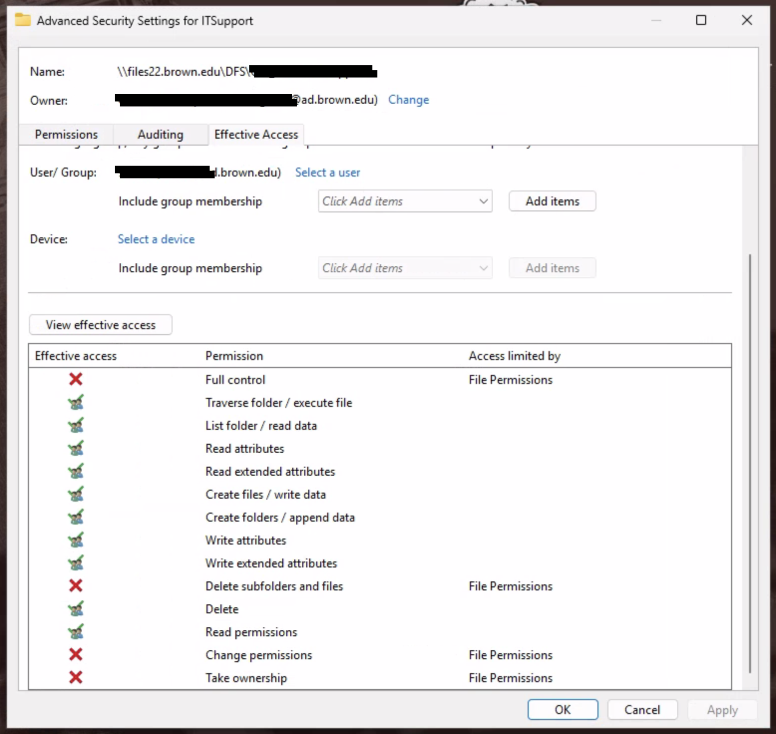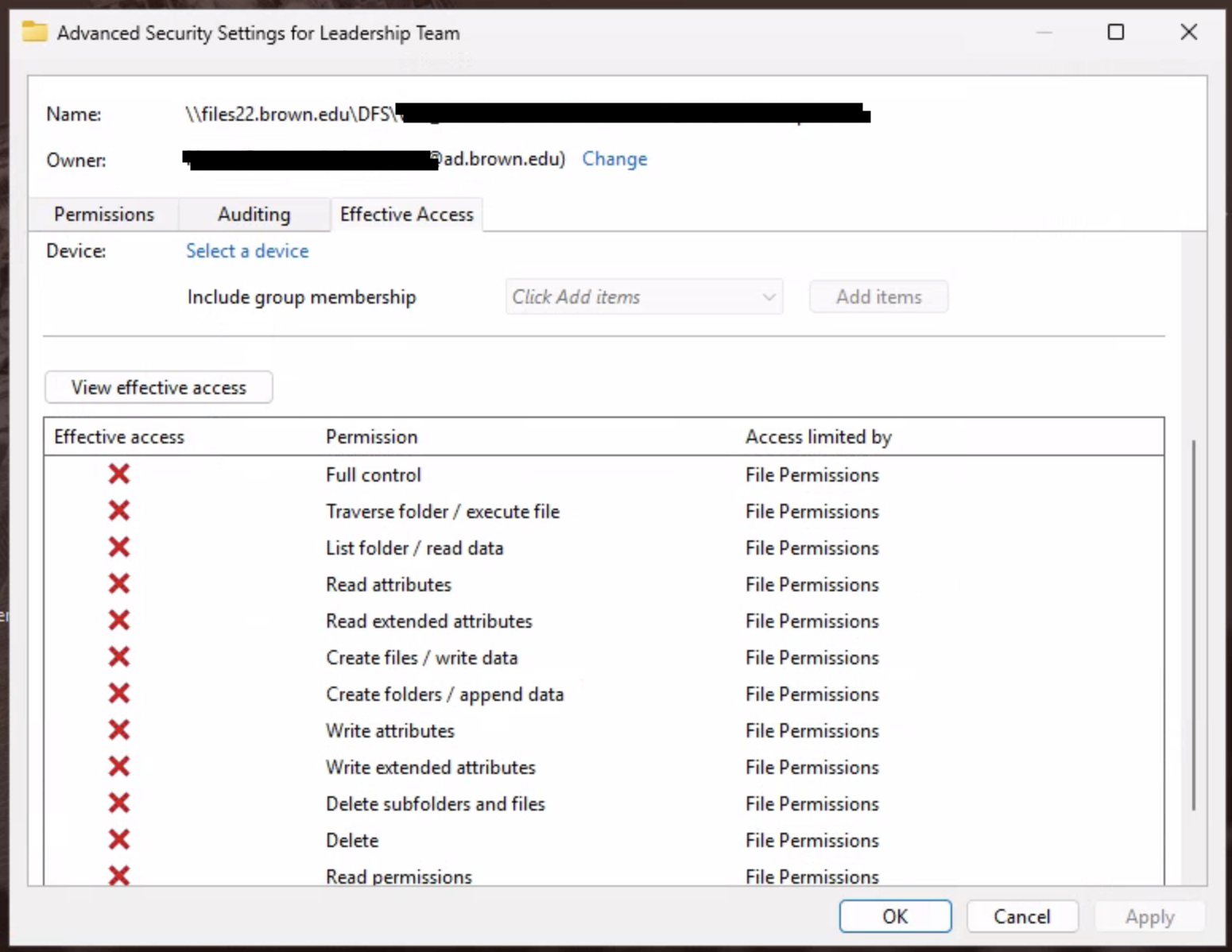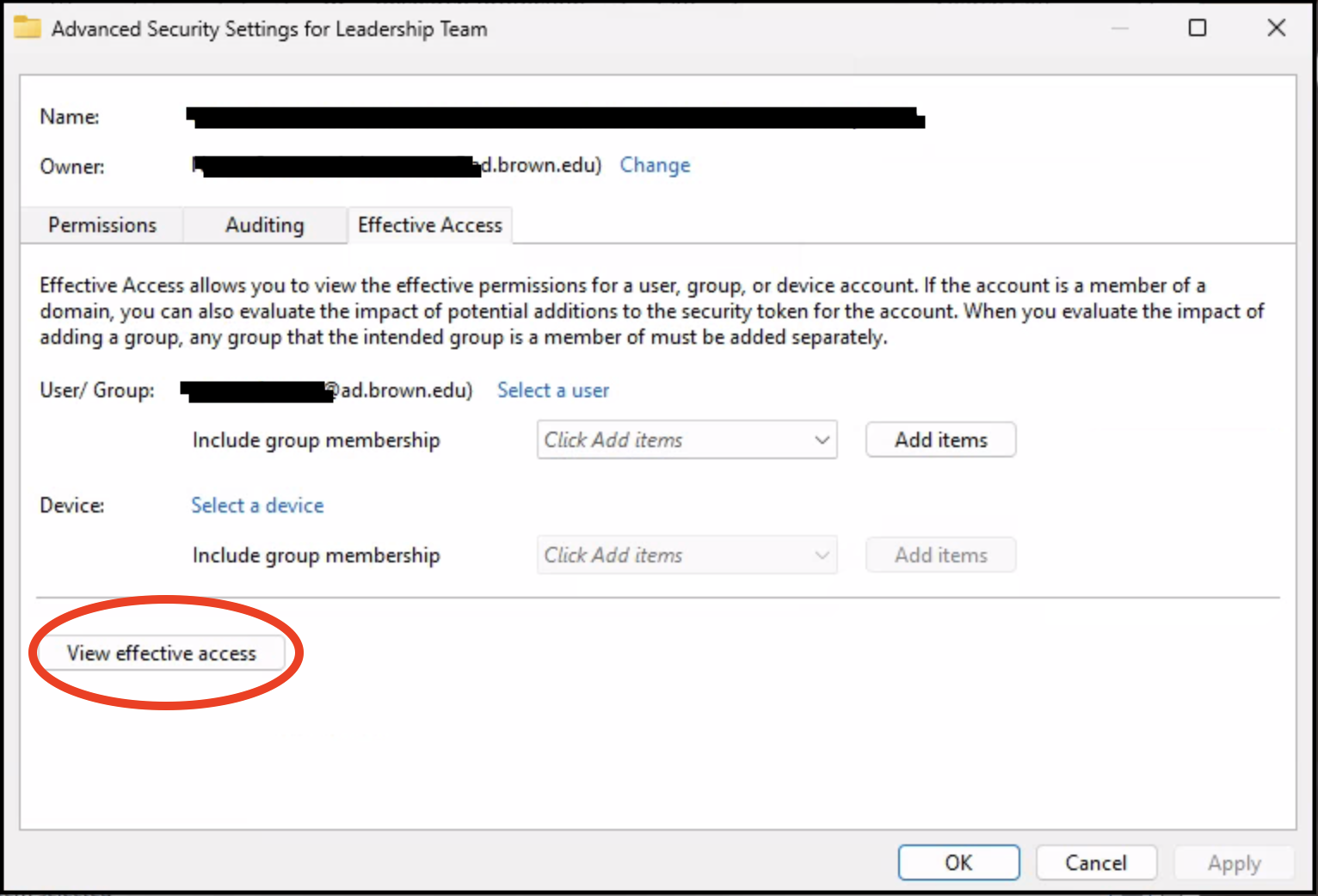 8. Back in the Advanced Security Settings window, click on View effective access.
