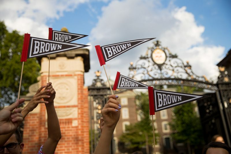 The alt text will depend on the context and intention of the image. For the image below, the alt text could be "Hands of students fly small Brown University pennants in front of the Van Wickle Gates during Commencement."