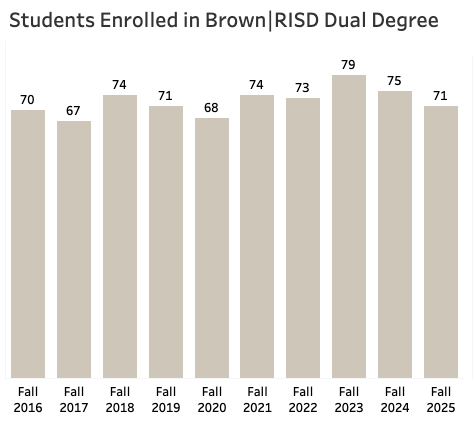 "Bar chart showing the number of students enrolled in the Brown-RISD Dual Degree program from Fall 2016 to Fall 2025. Enrollment peaked in Fall 2023 with 79 students."