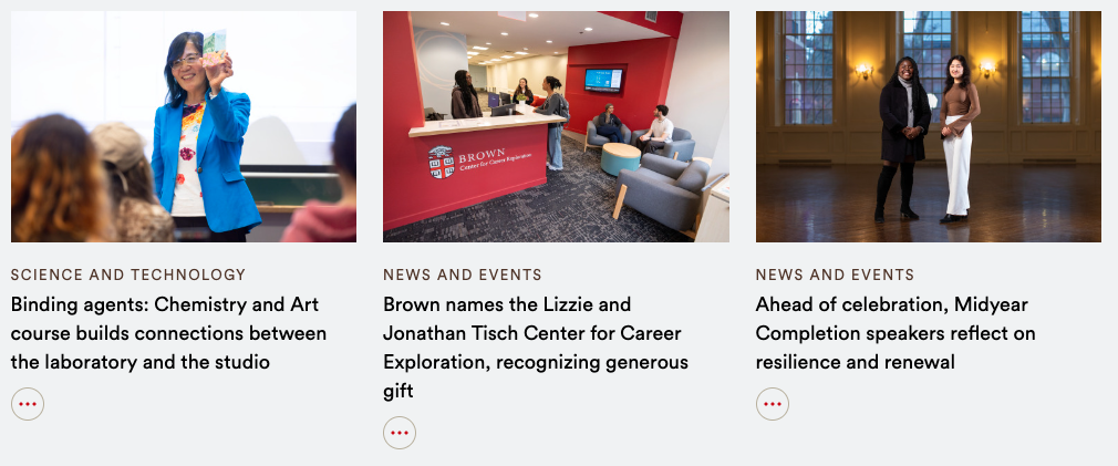 Images may also be used in conjunction with other text on the page without providing any additional content or information. For example, when looking at a list of news articles from the Brown website, there is both the title of the story and the picture from the story. In this context, the image doesn’t provide any additional relevant information to a user that is trying to decide if they want to read additional details about the event or not. The news could therefore have a NULL alt text for each image.
