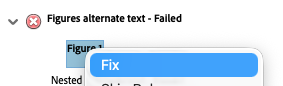 - Right click (Control Click on Mac) the item with issue and select Fix. For example, if an image is missing Alt Text, selecting Fix will allow you to add it.