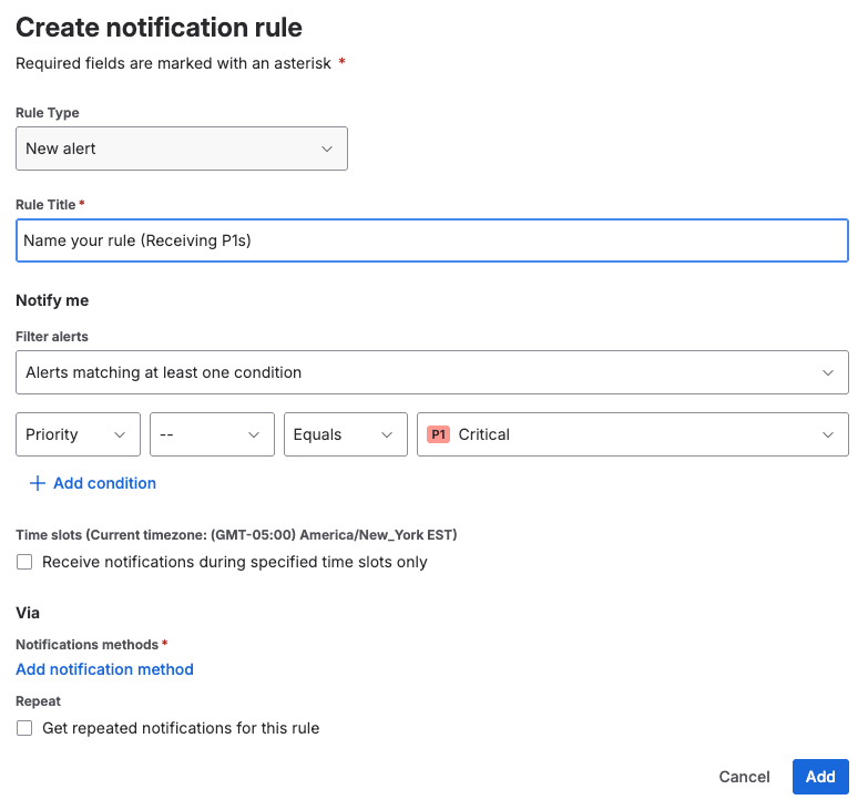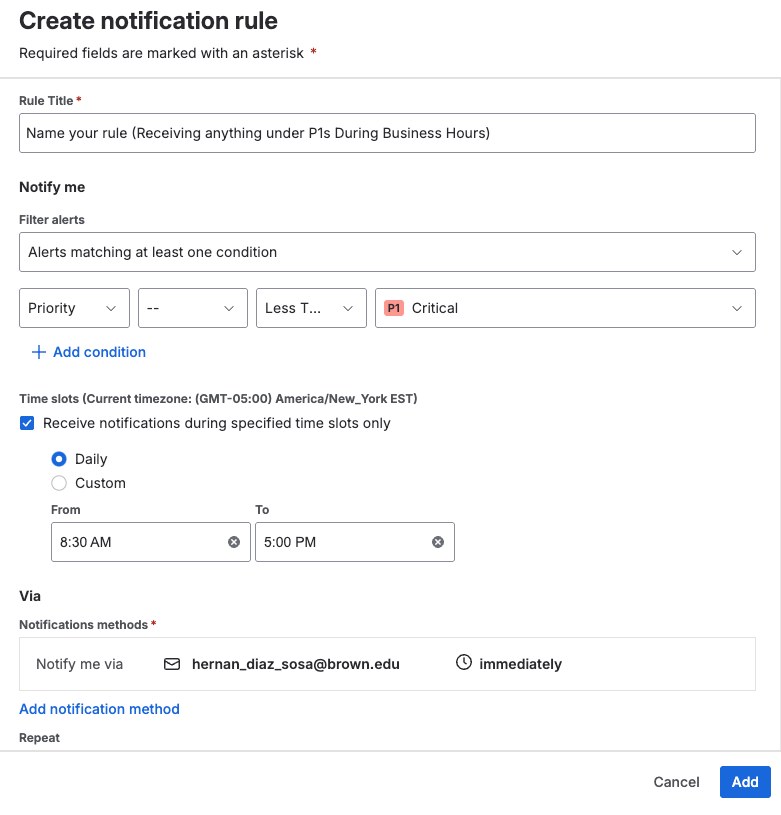 You can configure when and how to receive your alert notifications. Create a rule for each of your contact methods by specifying when to receive the notifications. You can delay receiving notifications for up to 1 day. You can add multiple rules and enable or disable them at any time. Jira Service Management attempts each method in the order you specify, one by one, until it reaches the alert.
