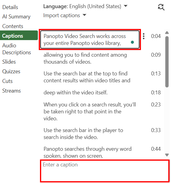 In the Panopto editor window that opens, the Captions tab is located on the left-hand side of the screen. These captions can be edited by clicking on the text. Line breaks can be inserted using the keyboard shortcut Shift+Enter. Once you're satisfied with the edits, press Enter to submit the new entry.