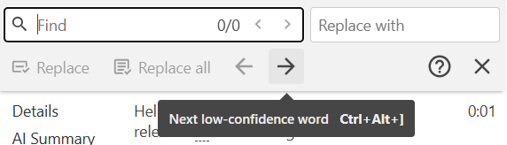 If the captions were created via ASR (automatic captions), the Find & Replace bar will also highlight low-confidence words. When there is nothing in the search bar, use the arrow keys or Ctrl+Alt+] to navigate through these words.