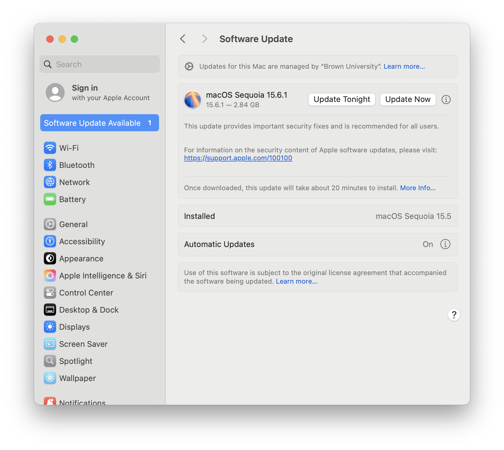 As of Fall 2025, most Brown-managed Macs can use the "Nudge" software helper application to keep your computer up to date. Nudge notifies you when a macOS minor update or major upgrade is needed, brings you to the update screen, and assists in making your Mac safe and secure.