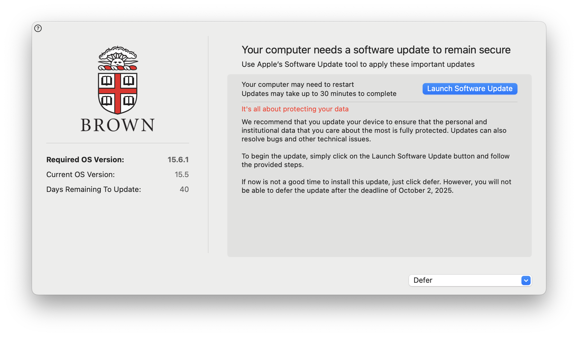 Yes. Installing regular updates on Brown-owned computers is University policy. Apple software updates contain many security fixes that protect your computer and your data. - What is the timeline?